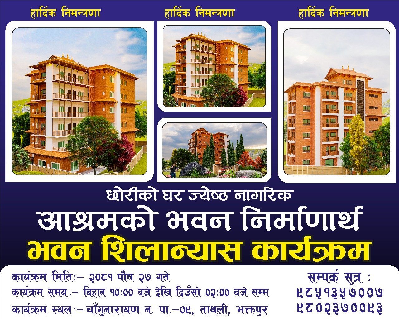 भक्तपुर जिल्लाको चाँगुनारायण नगरपालिका वार्ड नं.९ ताथलीमा सञ्चालित छोरीको घर ज्येष्ठ नागरिक आश्रम अब निर्माण हुने भएको छ । उक्त आश्रम निर्माणको लागि आगामी पौष २७ गते सनिवार शिलान्यास कार्यक्रम तय भएको छ ।