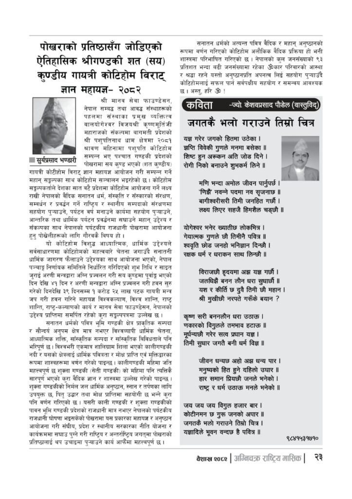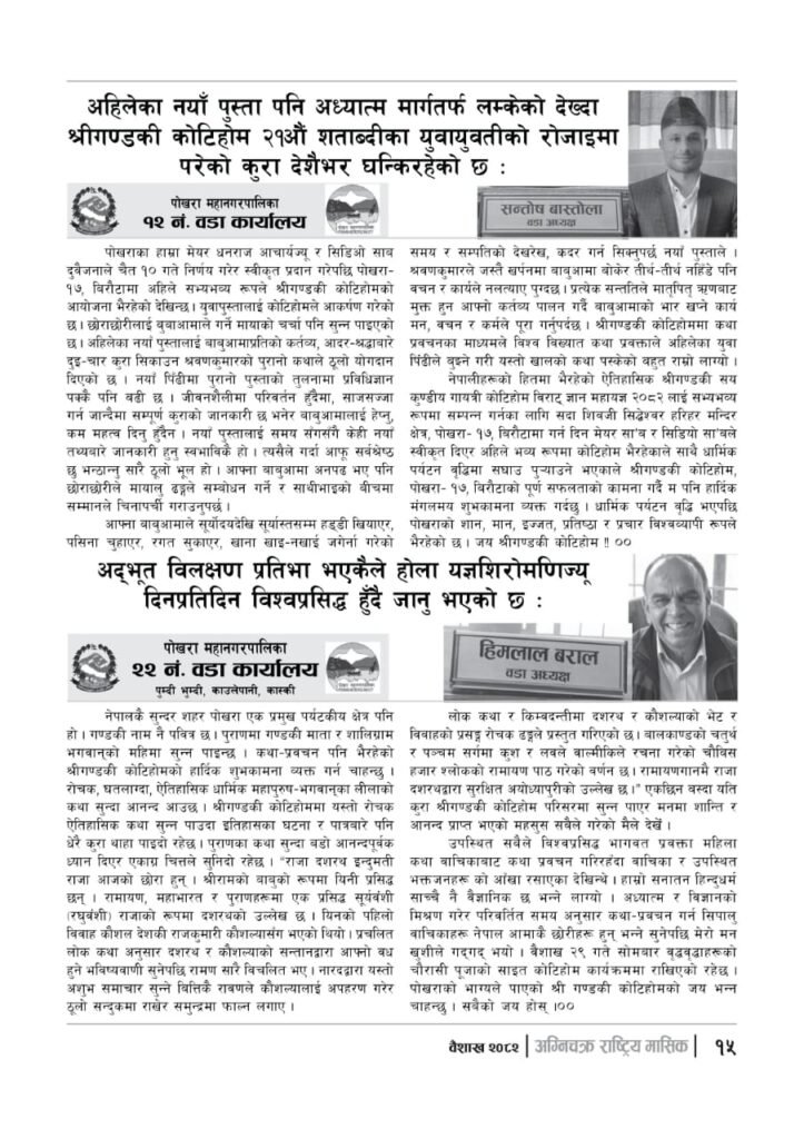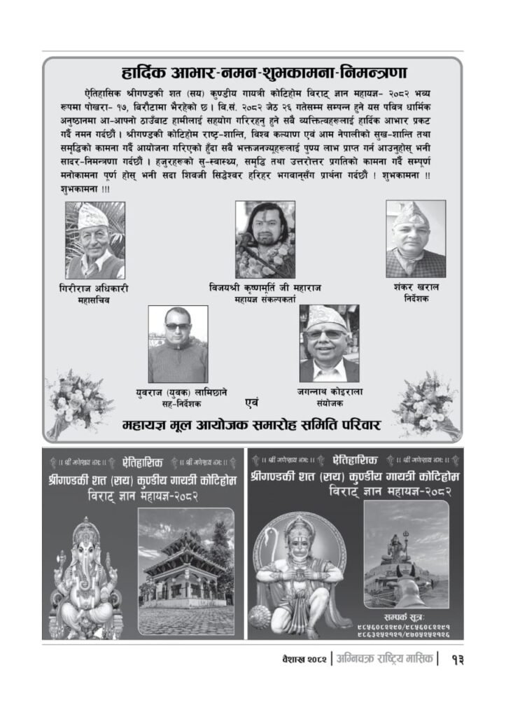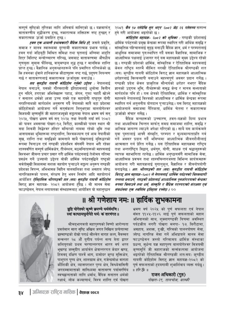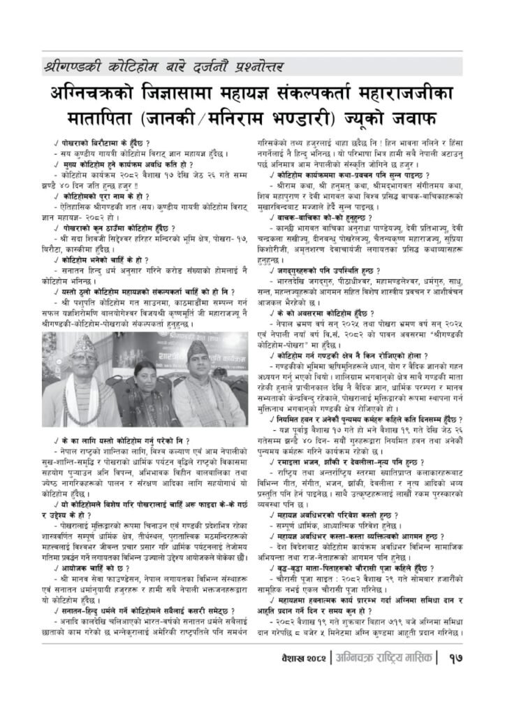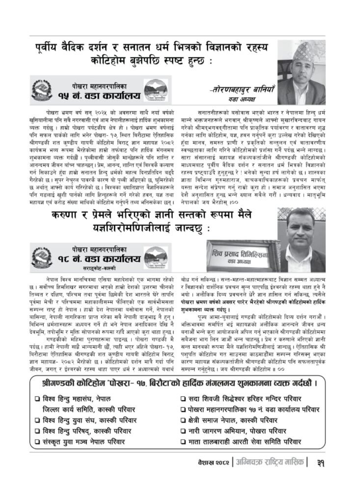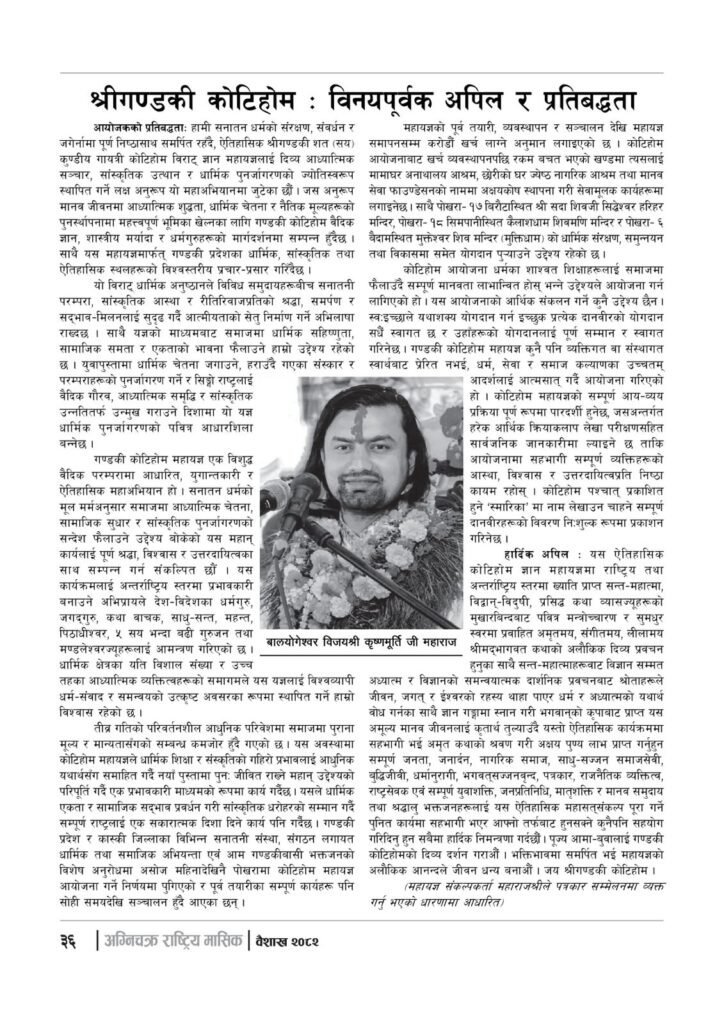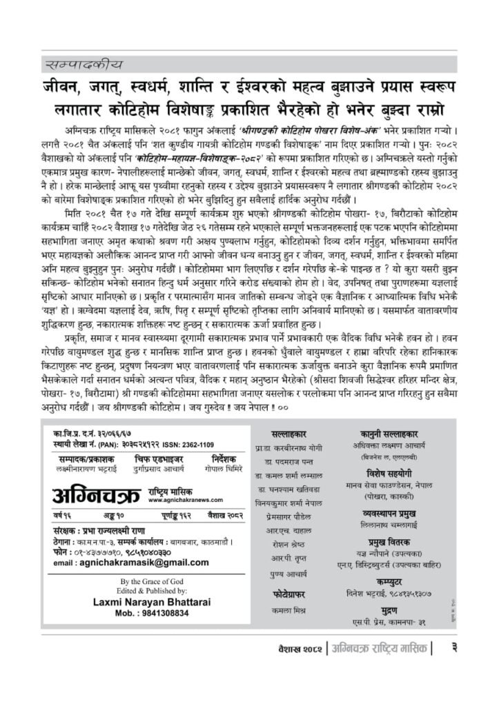 यज्ञशिरोमणि बालयोगेश्वर विजयश्री कृष्णमूर्ति जी महाराजज्यूले संकल्प गर्नुभएको श्री गण्डकी कोटिहोम पोखरा-१७, बिरौटाको सम्पूर्ण विषयवस्तु समेटिएको “अग्निचक्र राष्ट्रिय मासिक- कोटिहोम-महायज्ञ-विशेषाङ्क २०८२” प्रकाशित भएको छ | सभामुखज्यूले कोटिहोमलाई दिनुभएको शुभकामना समेत अग्निचक्रमा प्रकाशित भएको छ |