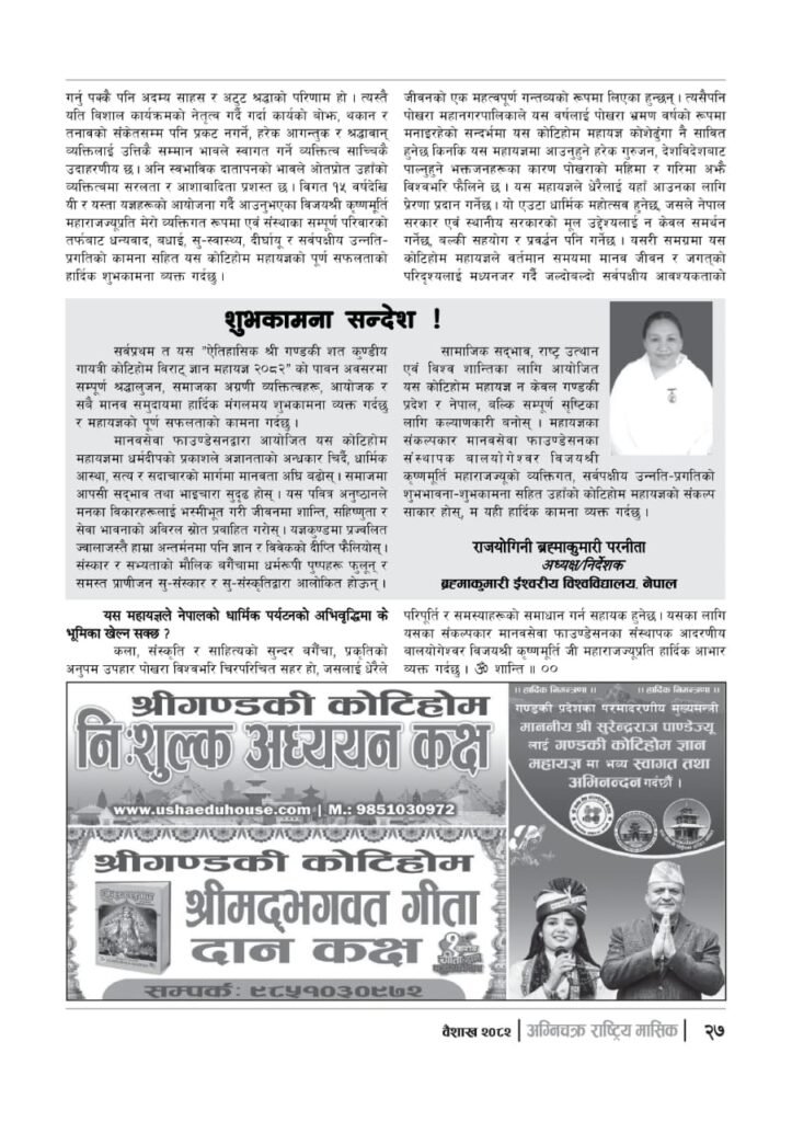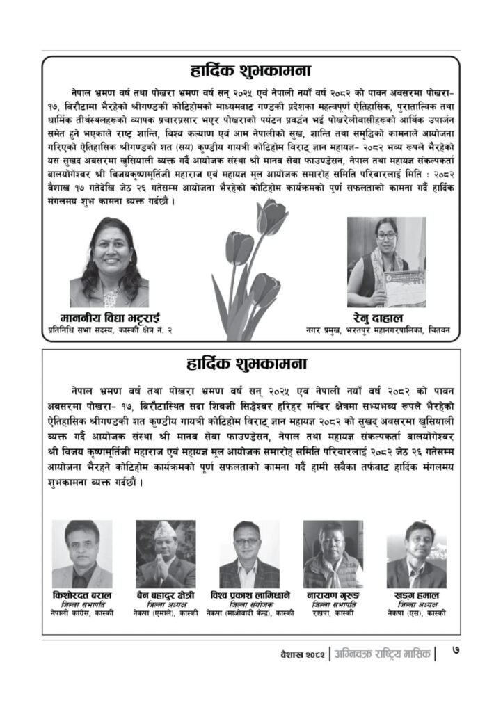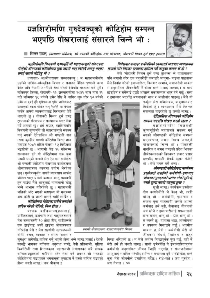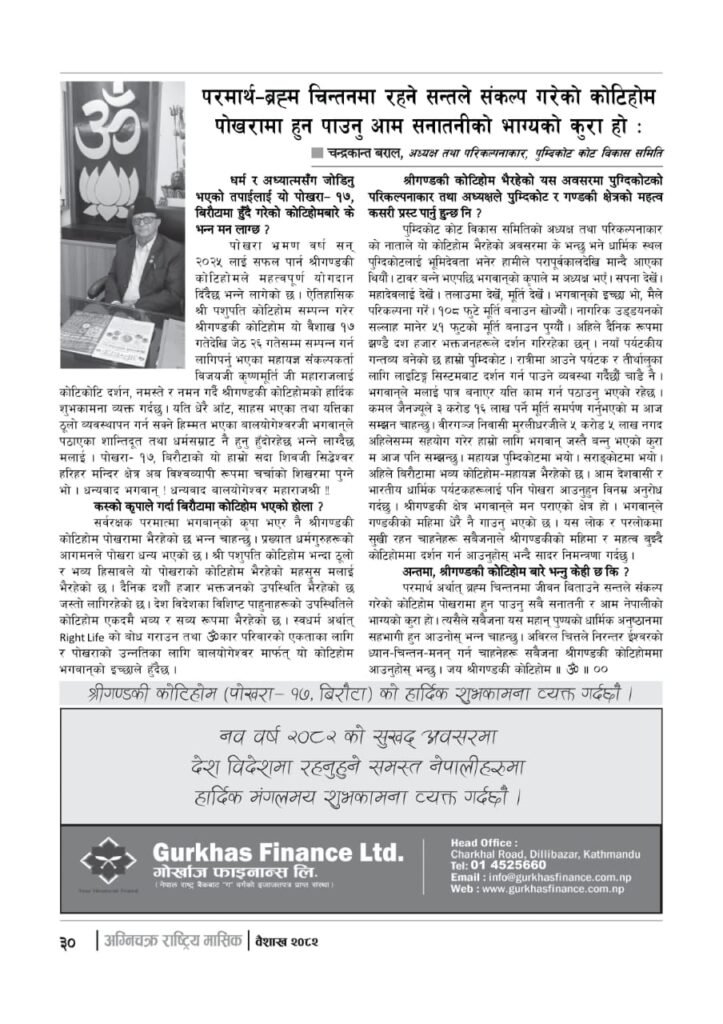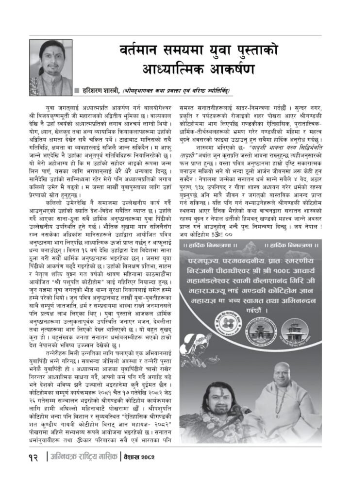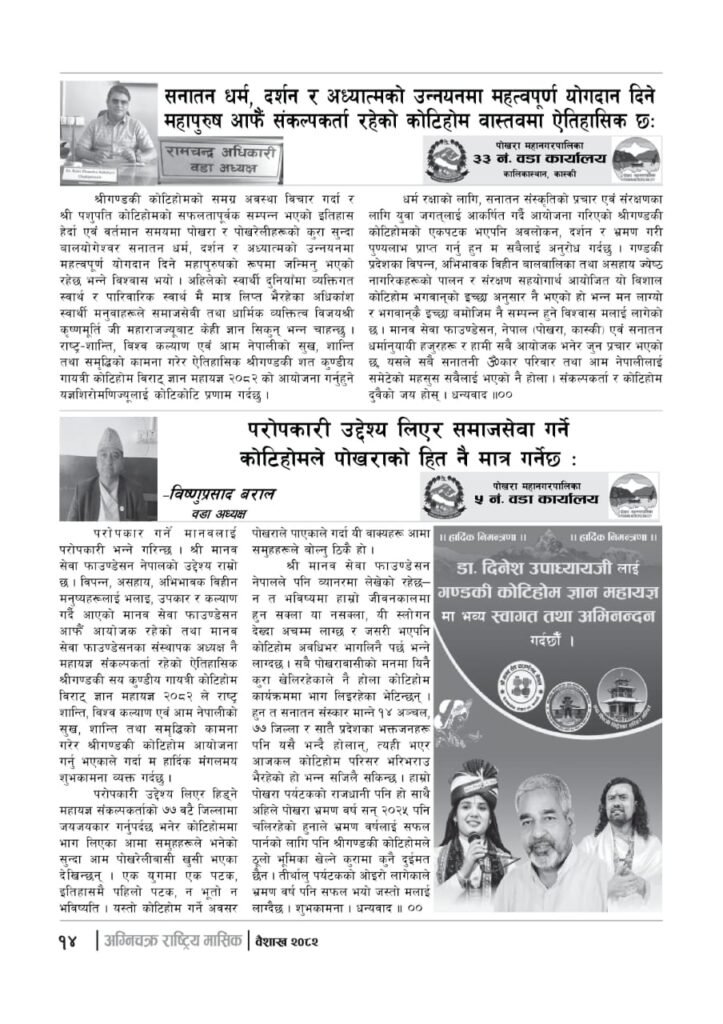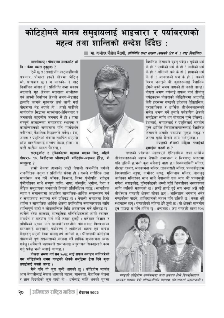 यज्ञशिरोमणि बालयोगेश्वर विजयश्री कृष्णमूर्ति जी महाराजज्यूले संकल्प गर्नुभएको श्री गण्डकी कोटिहोम पोखरा-१७, बिरौटाको सम्पूर्ण विषयवस्तु समेटिएको “अग्निचक्र राष्ट्रिय मासिक- कोटिहोम-महायज्ञ-विशेषाङ्क २०८२” प्रकाशित भएको छ | सभामुखज्यूले कोटिहोमलाई दिनुभएको शुभकामना समेत अग्निचक्रमा प्रकाशित भएको छ |