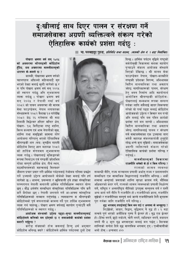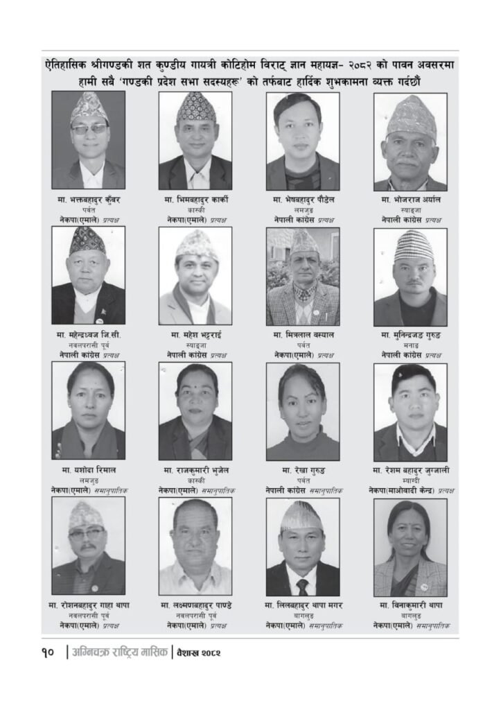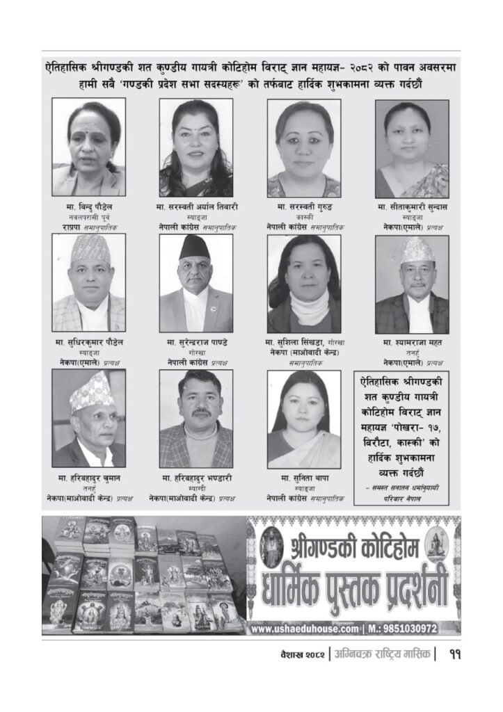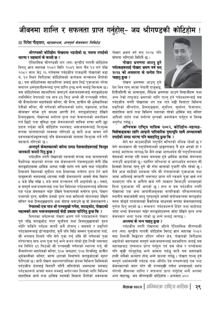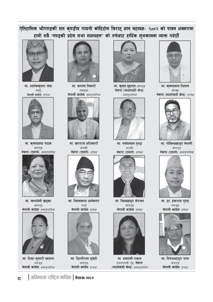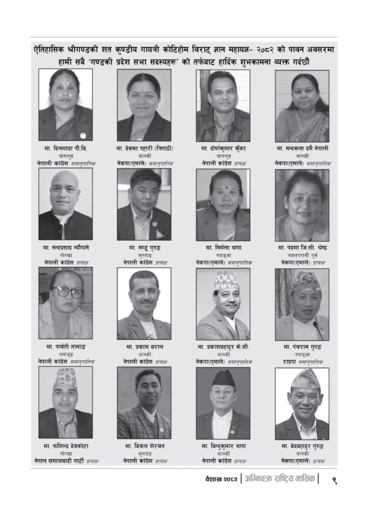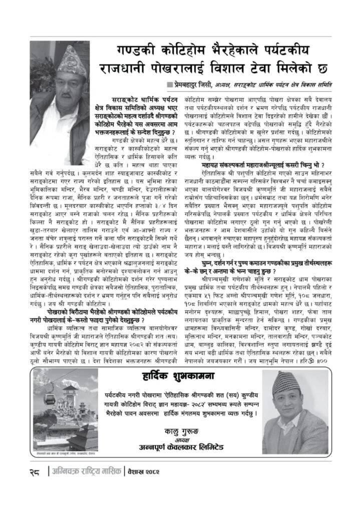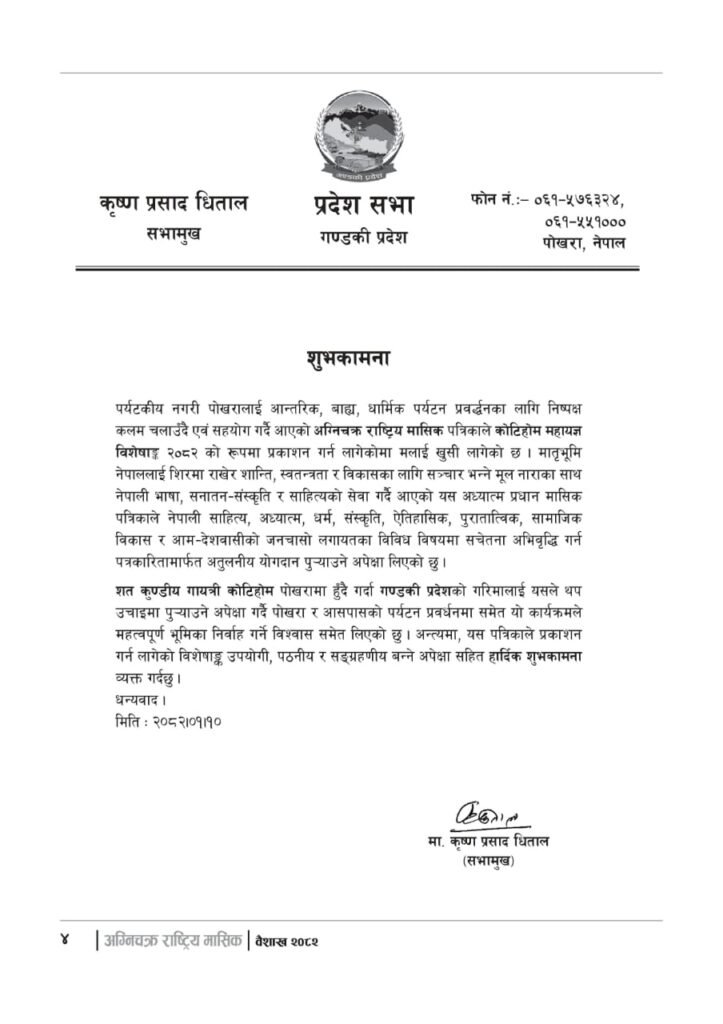 यज्ञशिरोमणि बालयोगेश्वर विजयश्री कृष्णमूर्ति जी महाराजज्यूले संकल्प गर्नुभएको श्री गण्डकी कोटिहोम पोखरा-१७, बिरौटाको सम्पूर्ण विषयवस्तु समेटिएको “अग्निचक्र राष्ट्रिय मासिक- कोटिहोम-महायज्ञ-विशेषाङ्क २०८२” प्रकाशित भएको छ | सभामुखज्यूले कोटिहोमलाई दिनुभएको शुभकामना समेत अग्निचक्रमा प्रकाशित भएको छ |